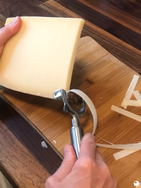 Don’t buy the parmesan cheese in the jar, or shredded cheese of any kind. You really want shaved pieces. If you use shredded cheese the flavor will be completely different. It will almost melt into the lettuce as opposed to getting a bite of cheese from the shavings. Trust me on this. You want a wedge of parmesan cheese that you shave.. Start at the narrow end of the piece of cheese, and using a vegetable peeler, shave the end of the cheese. I think a vegetable peeler is the easiest, but you can also use a cheese grater that has a slicer, but watch you fingers! (If you use a grater or a mandolin I actually suggest investing in a kevlar slicing glove. They are inexpensive, especially compared to a trip to the emergency room.)
